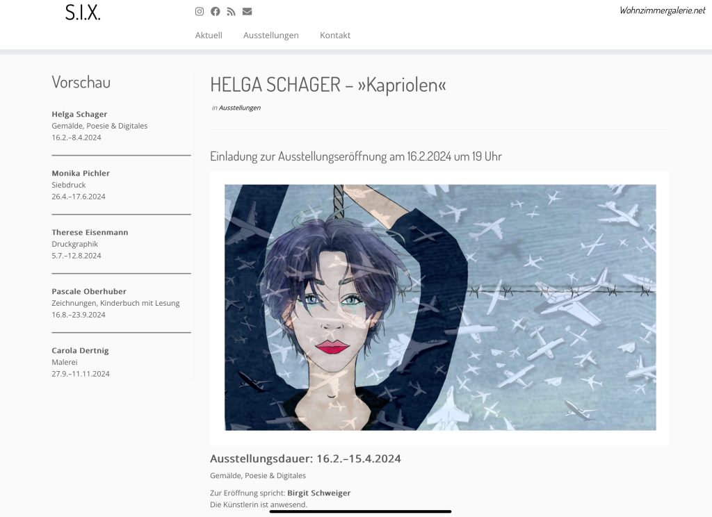 Am 16.2. 2024 eröffne ich die Ausstellung von HELGA SCHAGER „KAPRIOLEN“ in der Wohnzimmergalerie SIX in Seewalchen. Manchmal darf man auch in einer ungewohnten Form auftreten – und ich freu mich sehr darauf! https://www.wohnzimmergalerie.net/2024/01/helga-schager-kapriolen/