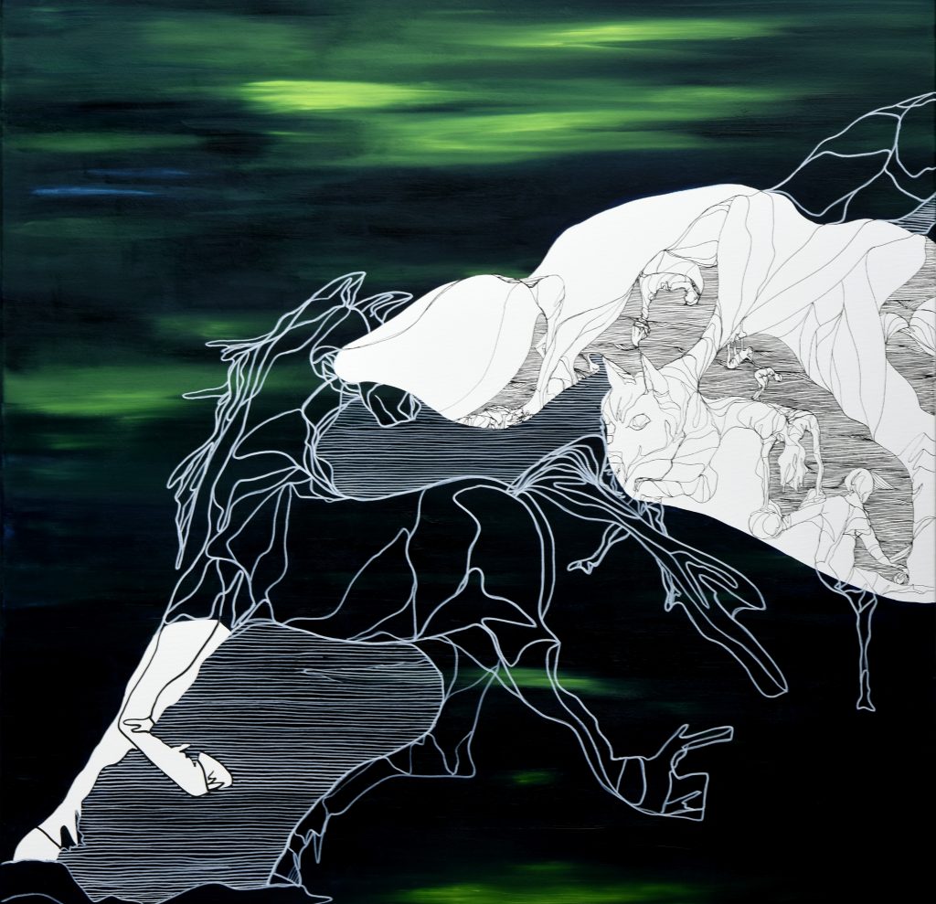 Titel: The grass is greener_horsish I, 2024, 100×100 cm, Öl/Lack/Tuscheliner/Canvas