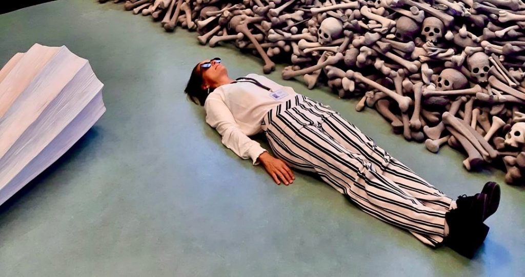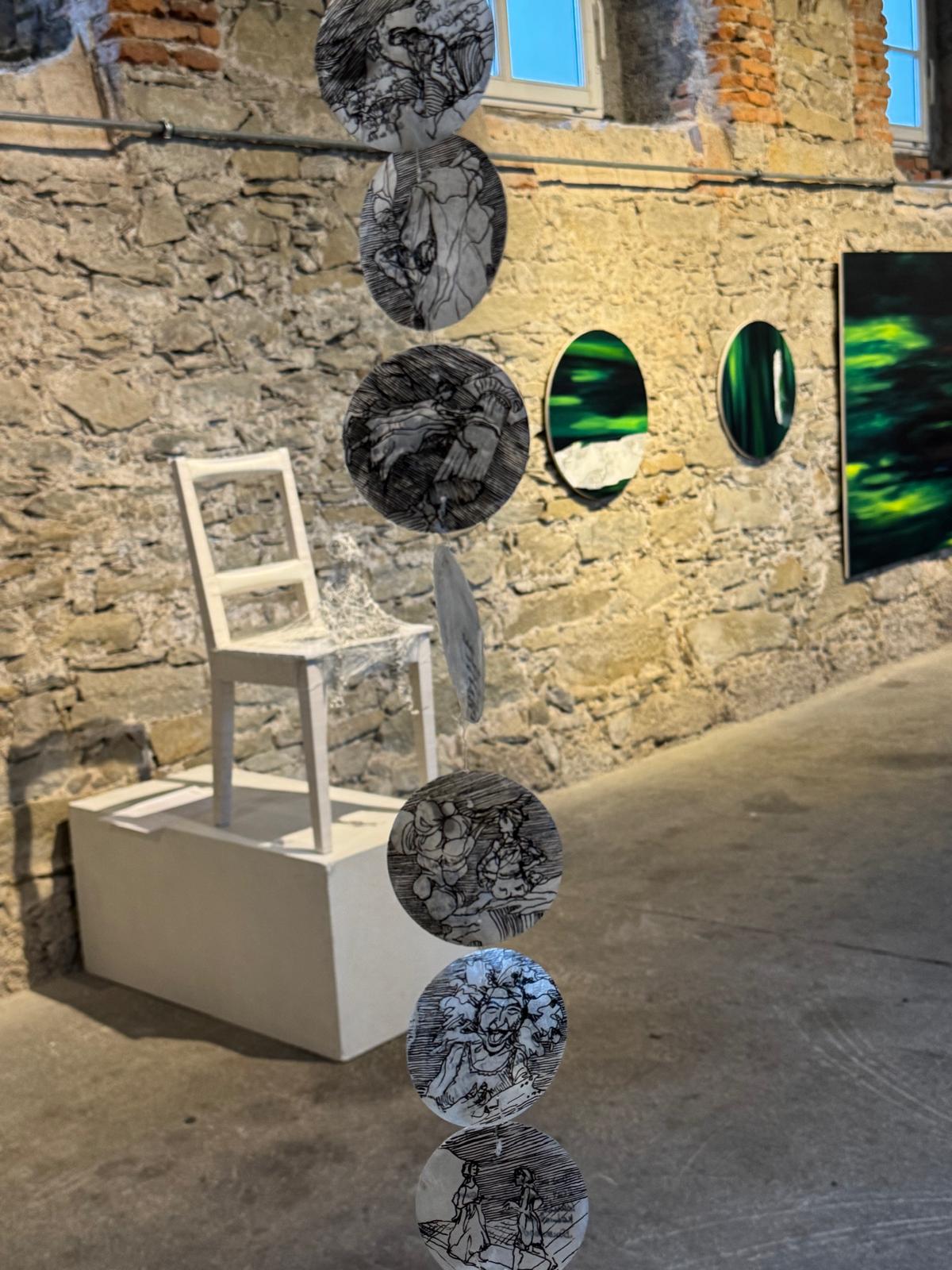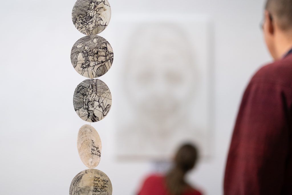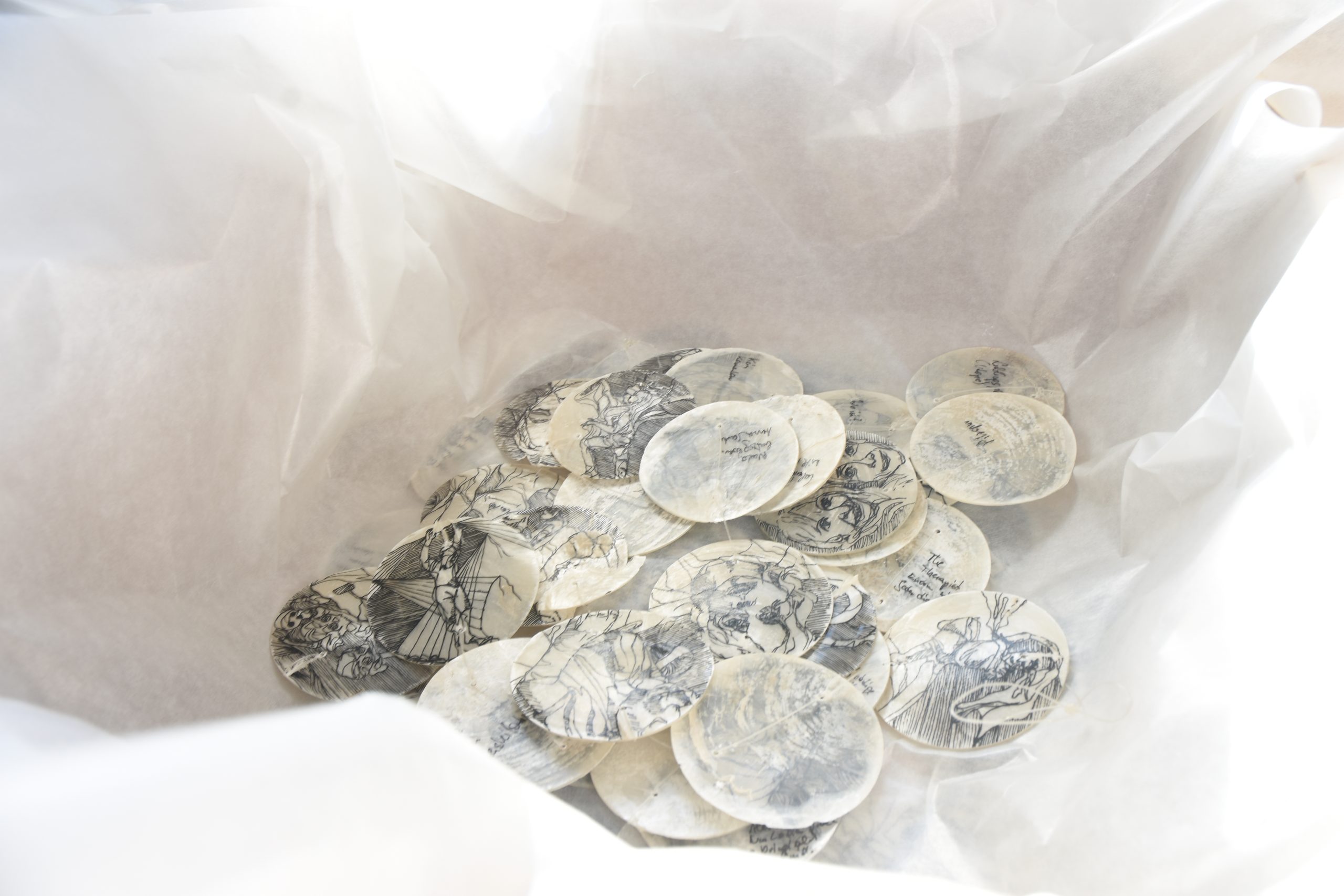 (c) Evelyn Kreinecker(c) Andrea TrawögerIch, mit mir verkettet, Selbstbetrachtung 2024, Lackmarker/Perlmutt-Muschel, Rauminstallation1