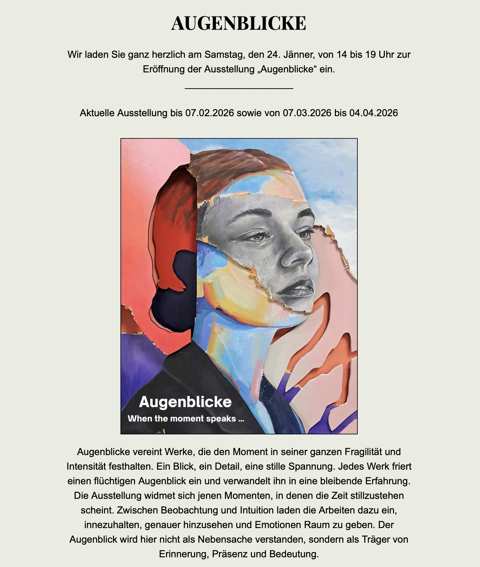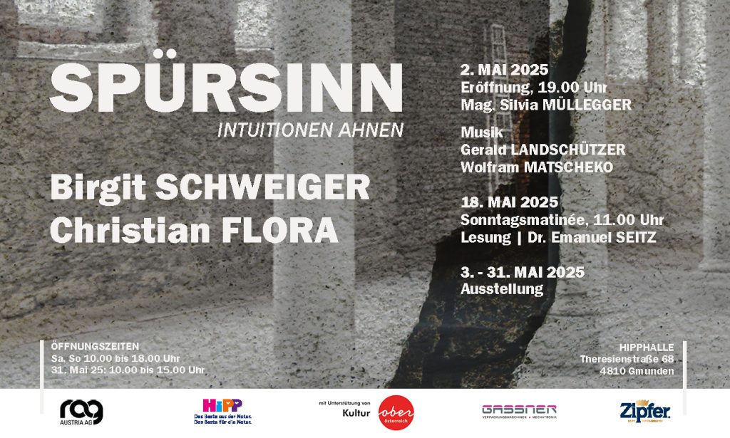 Mit mir gemeinsam wird mein geschätzter Kollege Christian Flora seine neuesten Arbeiten zeigen. Bereits seit einem Jahr arbeiten wir an dieser Ausstellung und wir freuen uns schon sehr auf eine fulminante Eröffnung. Eröffnet wird die Ausstellung am 2. Mai um 19 Uhr von Mag. Silvia Müllegger, Kunsthistorikerin aus Wien. Gerald Landschützer hat eigens für die Ausstellung drei Stücke komponiert, die bei der Eröffnung uraufgeführt werden – in Begleitung des Sängers Wolfram Matscheko.