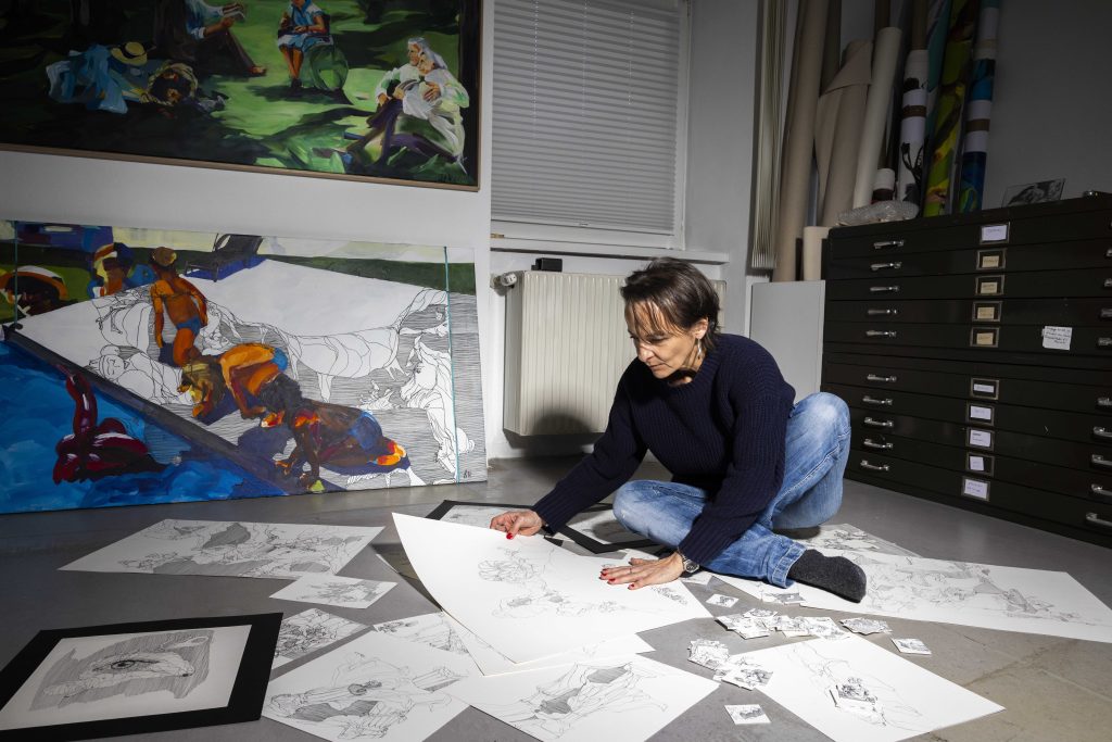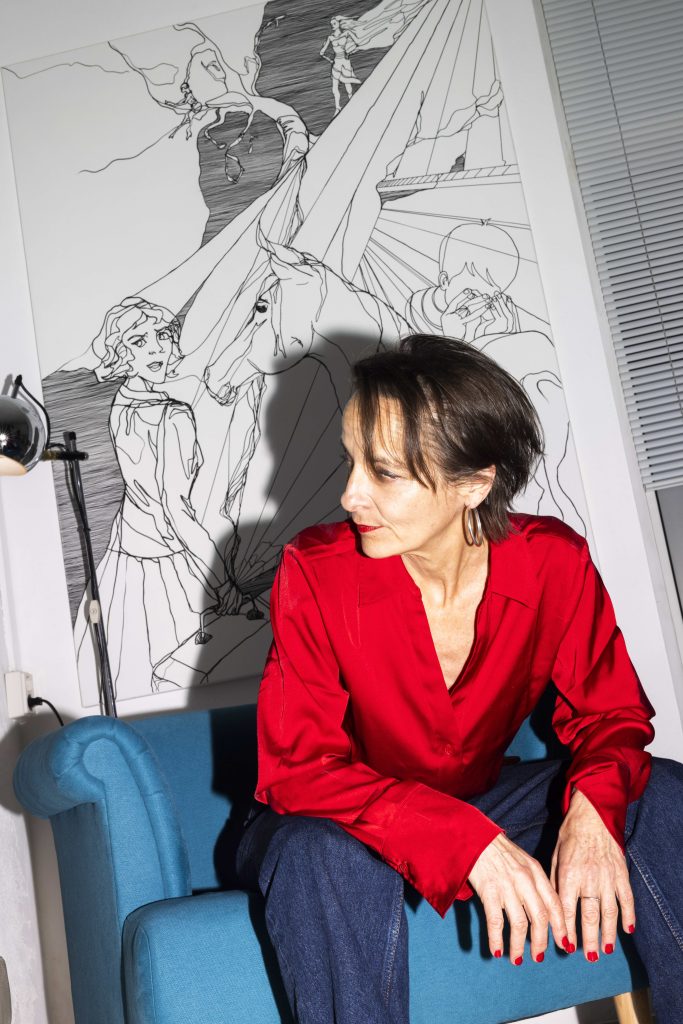 Birgit Schweiger vor der großen Wandzeichnung im EG, Foto: (c) apa-Fotoservice