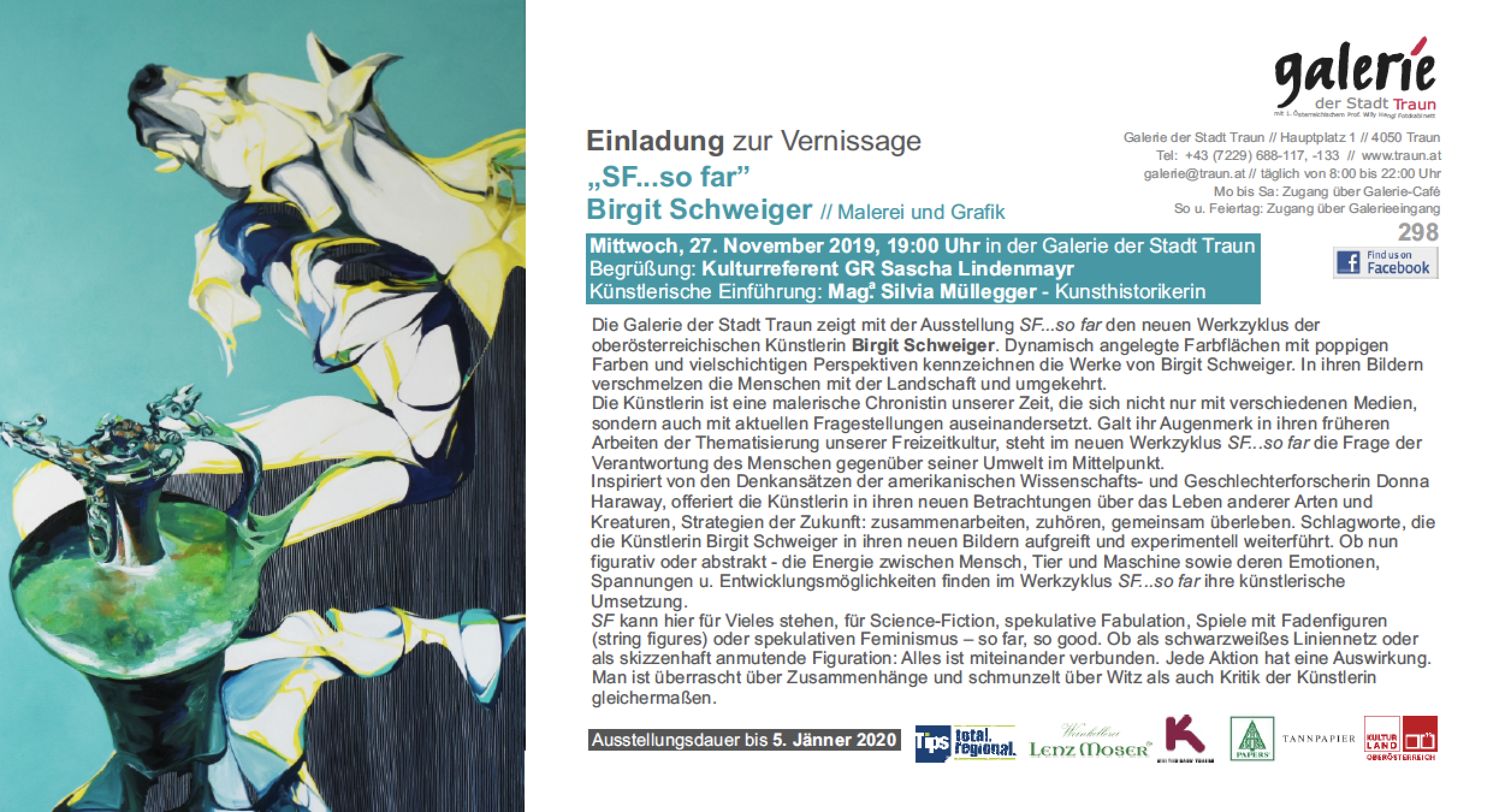Gerne möchte ich auch zu meiner kommenden Einzelausstellung in der Galerie der Stadt Traun am 27.11.2019, Beginn 19 Uhr, einladen. Es werden ausschließlich neue Arbeiten gezeigt, gebündelt unter dem Thema "SF....so far".
