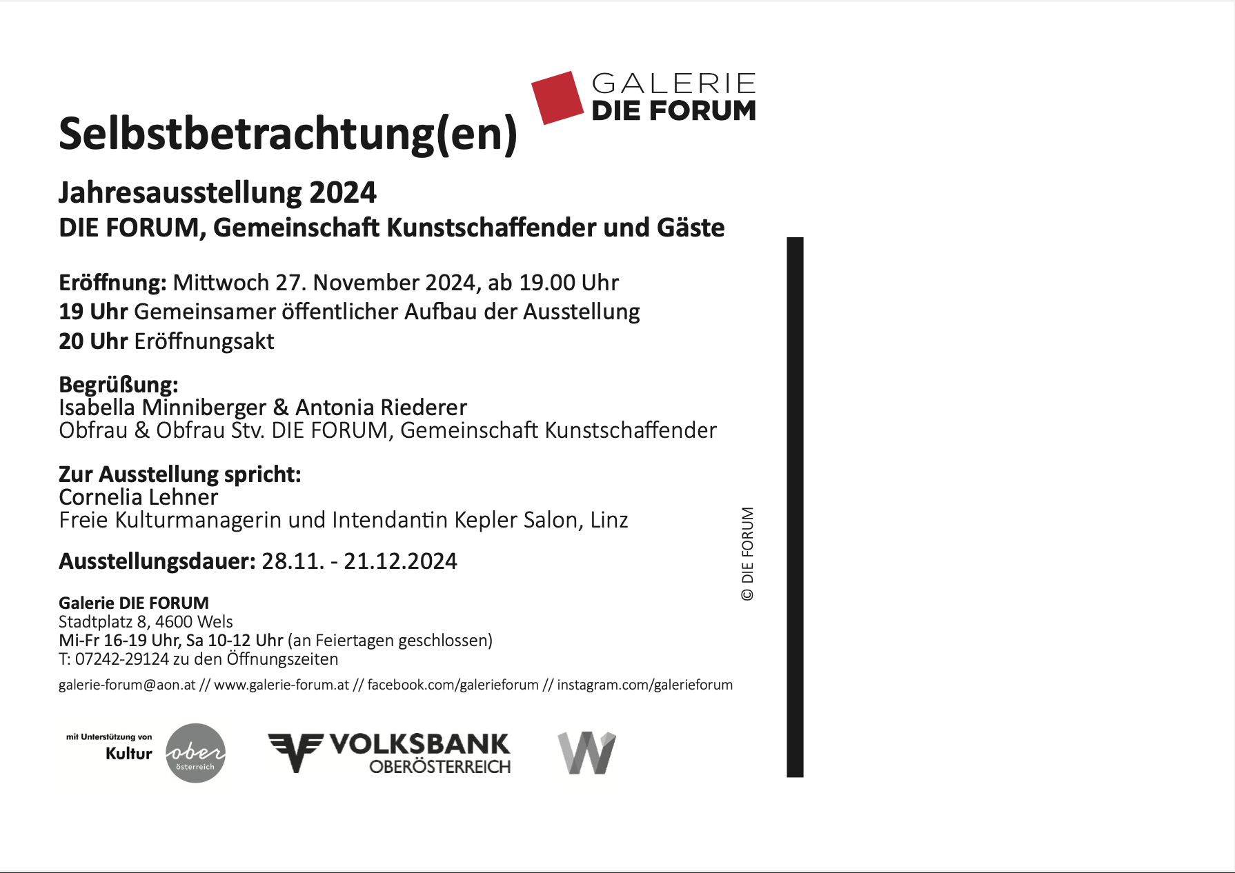 Diese Woche Mittwoch findet der jährliche Live-Act in der Galerie DIE FORUM in Wels statt. Gemeinsam wird ab 19 Uhr die Jahresausstellung zum Thema "SELBSTBETRACHTUNGEN" aufgebaut, in einem performativen Prozess, bei dem auch viele neue Gesichter! zu sehen sein werden.